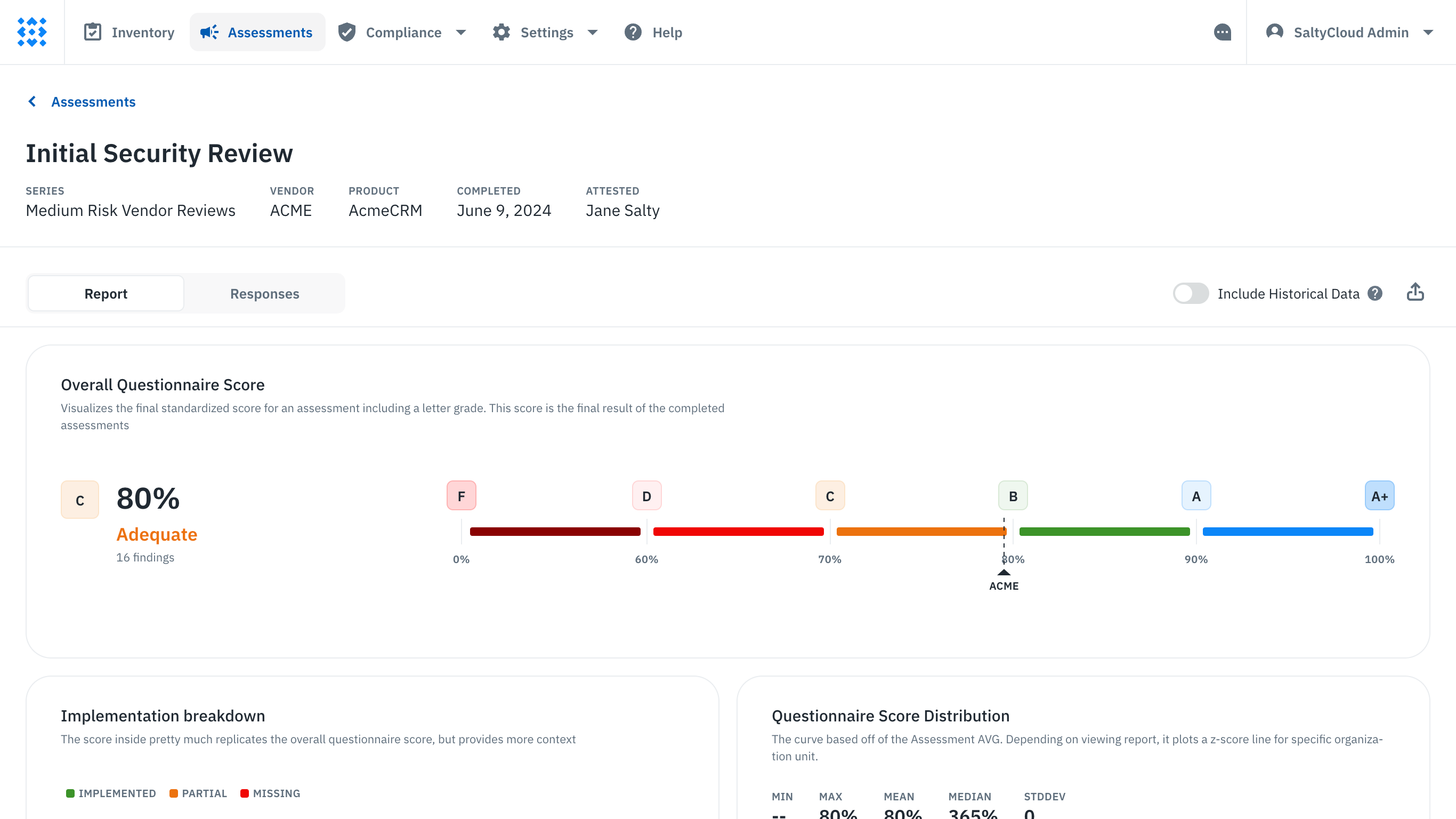 With Isora, this crucial step becomes organized and efficient. After the external contact submits their completed survey, Isora automatically scores the responses and arranges all evidence for your review. The platform provides an array of widgets for a quick overview, including scores for the overall questionnaire and by each question category. This immediate visualization allows for a rapid assessment of areas where responses were less than favorable, prompting a closer review.