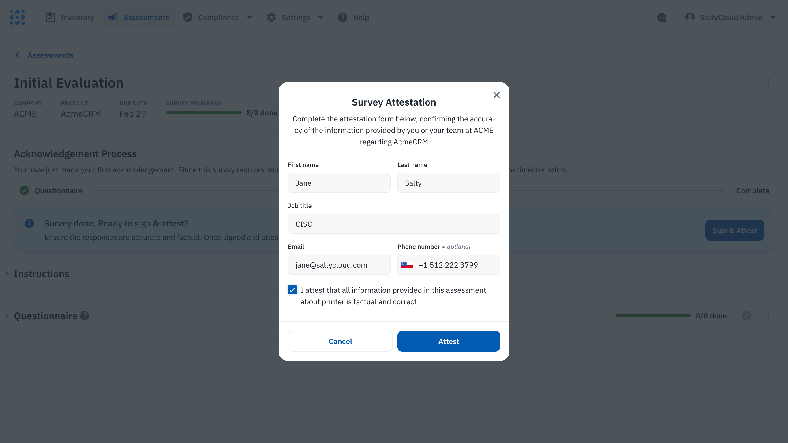 This attestation is not just a formality—it plays a critical role in the assessment process. The act of attesting formalizes the vendor’s accountability for the provided information. After the attestation is completed all responses are securely saved and the attestation contact details are stored within the system, which is vital for any future audits, ensuring that there is a clear trail of accountability.