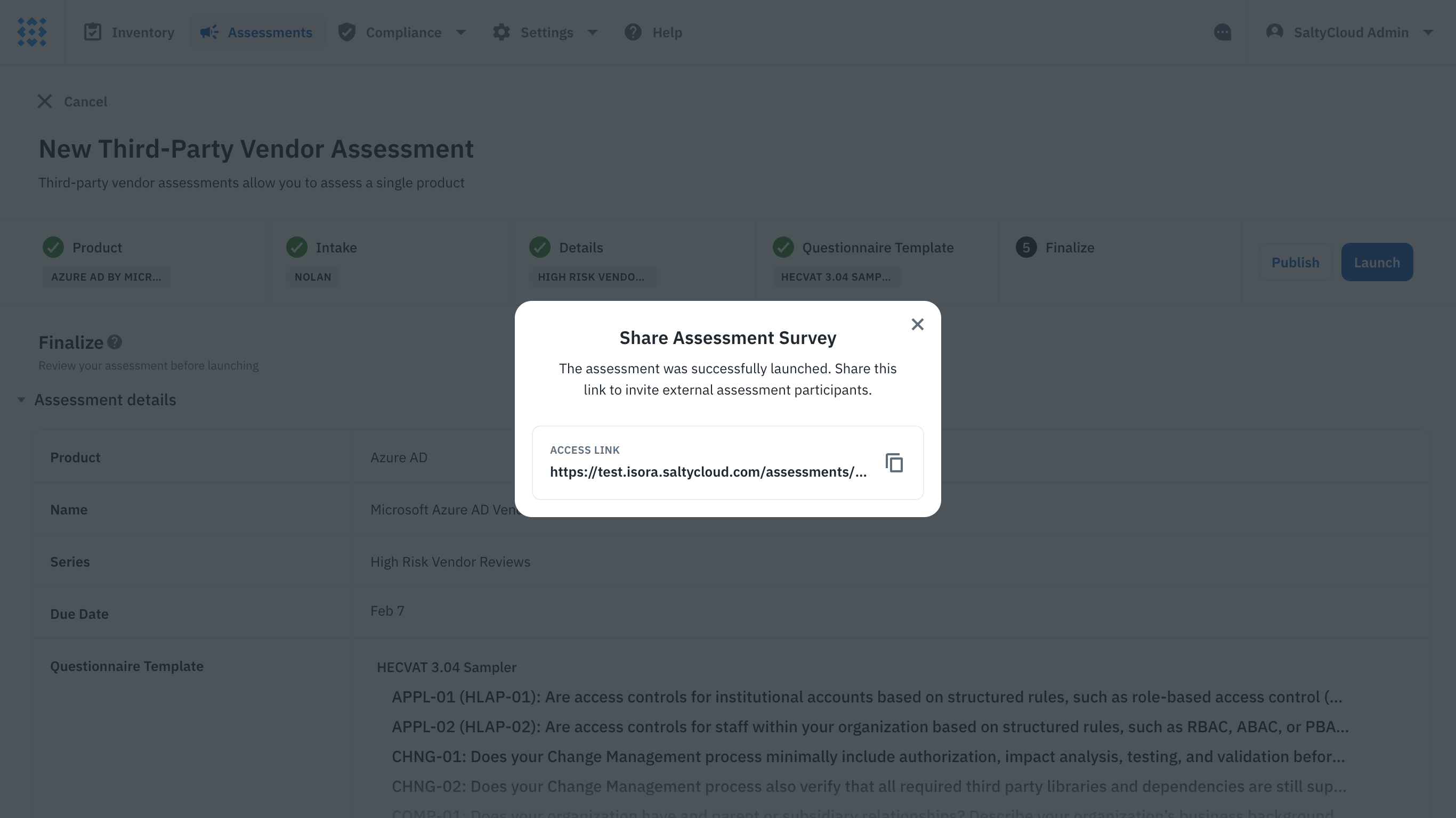 Furthermore, you can select a questionnaire template that aligns with popular security frameworks from Isora’s preloaded options, or you may create a custom template to fit your assessment criteria better.