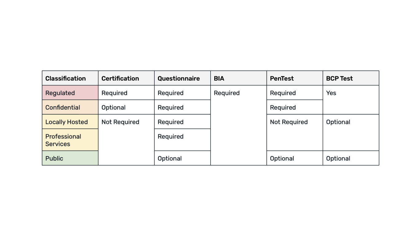 A simple example of a third-party security risk assessment requirement rubric where a series of data classifications are tied to a series of evidentiary requirements.